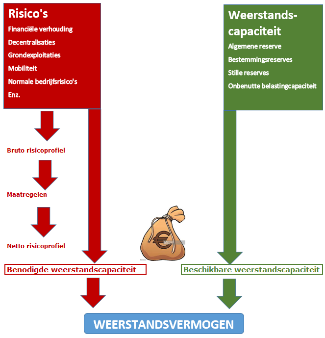 Het besluit Begroting en Verantwoording (BBV, artikel 11) definieert het weerstandsvermogen als de relatie tussen de capaciteit om tegenvallers op te vangen (weerstandscapaciteit) en de materiële risico's waarvoor geen specifieke voorzieningen zijn getroffen.